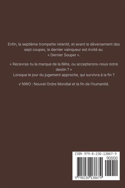 ¿ L'Ombre de l'État : La Trilogie < L'Histoire de la Main Invisible > ¿ Dans les coulisses de l'histoire humaine, des mains invisibles ont façonné le destin du monde. Guerres, révolutions, effondrement et reconstruction des systèmes financiers - l'ordre mondial s'est déroulé comme un script écrit à l'avance. Mais un homme a osé en douter. Le dernier héritier des francs-maçons, Simon Gray. ¿ ¿L'Ombre de l'État : Le Pacte de l'Âme¿ : Si tu veux le pouvoir, contracte ton âme. ¿ Lorsqu'il met la main sur le carnet de son grand-père , le voyage qui commence à Rome s'étend vers l'Angleterre et Israël. Il se retrouve face à trois puissances secrètes : les francs-maçons, Nemesis et Eden. · Nemesis : La puissance chinoise qui contrôle le monde. · Eden : Un groupe juif prônant la liberté humaine et le choix. · Les Francs-maçons : L'organisation qui a façonné le cours de l'histoire... mais ont-ils déjà sombré dans la décadence ? · Dans une guerre qui bouleverse le système financier mondial, Simon commence à douter de son identité, tandis qu'une phrase du carnet le hante : Soyez vigilants, vous ne savez pas quand le maître reviendra. ¿ ¿L'Ombre de l'État : Les Ongles Rouges¿ : Quand je jugerai, votre peau se brisera sous mes ongles. ¿ Un scandale de destitution simultané aux États-Unis et en Corée, une épidémie mystérieuse et un vaccin énigmatique, et l'apparition de la redoutable dirigeante de Nemesis, surnommée Les Ongles Rouges . Elle murmure : Vous connaîtrez la vérité, et la vérité vous rendra libres ? Vous vous trompez. La vérité est un collier de fer. La clé, c'est nous qui la détenons. · Simon et Raphaël suivent des indices en Corée, découvrant un plan mondial secret. La vérité cachée par ceux qui prônent la liberté commence à émerger : destitutions, élections truquées, émeutes de grande ampleur, désastres artificiels, preuves disparues... ¿ ¿L'Ombre de l'État : La Manipulation de la Mémoire¿ : Peut-on faire confiance à la mémoire humaine ? Quelle est la véritable nature du vaccin ? ¿ Une grande tribulation secoue le monde : guerre civile en Afrique, conflit au Moyen-Orient, tensions entre Taiwan et la Chine. Au cur de cette tourmente, Eden et Nemesis s'affrontent, et la Troisième Guerre mondiale éclate. Mais Simon ne peut plus faire confiance à ses souvenirs. Son passé, son identité, tout ce qu'il a combattu... Est-ce vraiment la vérité ? · Trois portes s'ouvrent : SILVER GATE, GOLDEN GATE, GOLVER GATE - Le destin de la guerre mondiale repose entre les mains d'Eden et de Nemesis. ¿ Enfin, la septième trompette retentit, et avant le déversement des sept coupes, le dernier vainqueur est invité au Dernier Souper . Recevras-tu la marque de la Bête, ou accepterons-nous notre destin ? Lorsque le jour du jugement approche, qui survivra à la fin ? ¿ NWO : Nouvel Ordre Mondial et la fin de l'humanité.