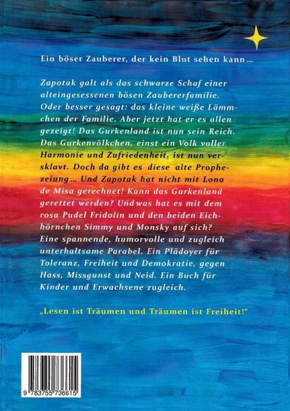 Ein böser Zauberer, der kein Blut sehen kann ...Zapotak galt als das schwarze Schaf einer alteingesessenen bösen Zaubererfamilie. Oder besser gesagt: das kleine weiße Lämmchen der Familie. Aber jetzt hat er es allen gezeigt! Das Gurkenland ist nun sein Reich. Das Gurkenvölkchen, einst ein Volk voller Harmonie und Zufriedenheit, ist nun versklavt. Doch da gibt es diese alte Prophezeiung ... Und Zapotak hat nicht mit Lona de Misa gerechnet! Kann das Gurkenland gerettet werden? Und was hat es mit dem rosa Pudel Fridolin und den beiden Eichhörnchen Simmy und Monsky auf sich? Eine spannende, humorvolle und zugleich unterhaltsame Parabel. Ein Plädoyer für Toleranz, Freiheit und Demokratie, gegen Hass, Missgunst und Neid. Ein Buch für Kinder und Erwachsene zugleich."Lesen ist Träumen und Träumen ist Freiheit!"Lisa und Mona Wagner, Illustratoren