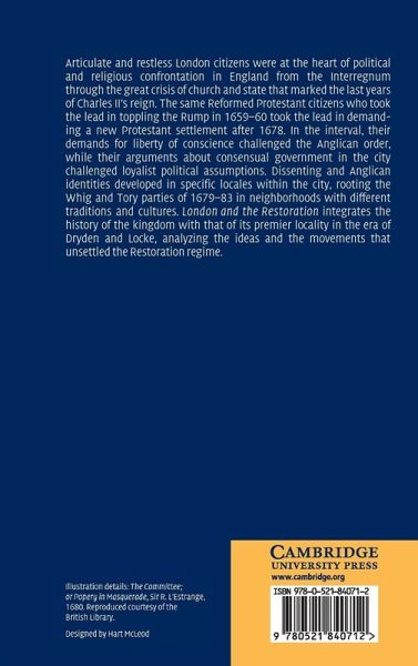 Articulate and restless London citizens were at the heart of political and religious confrontation in England from the Interregnum through the great crisis of Church and state that marked the last years of Charles II's reign. The same Reformed Protestant citizens who took the lead in toppling in toppling the Rump in 1659-60 took the lead in demanding a new Protestant settlement after 1678. In the interval, their demands for liberty of conscience challenged the Anglican order, whilst their arguments about consensual government in the city challenged loyalist political assumptions. Dissenting and Anglican identities developed in specific locales within the city, rooting the Whig and Tory parties of 1679-83 in neighbourhoods with different traditions and cultures. London and the Restoration integrates the history of the kingdom with that of its premier locality in the era of Dryden and Locke, analysing the ideas and the movements that unsettled the Restoration regime.