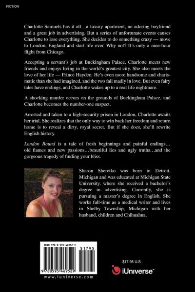 Charlotte Samuels has it all.a luxury apartment, an adoring boyfriend and a great job in advertising. But a series of unfortunate events causes Charlotte to lose everything. She decides to do something crazy - move to London, England and start life over. Why not? It's only a nine-hour flight from Chicago. Accepting a servant's job at Buckingham Palace, Charlotte meets new friends and enjoys living in the world's greatest city. She also meets the love of her life - Prince Hayden. He's even more handsome and charismatic than she had imagined, and the two fall madly in love. But even fairy tales have endings, and Charlotte wakes up to a real life nightmare. A shocking murder occurs on the grounds of Buckingham Palace, and Charlotte becomes the number-one suspect. Arrested and taken to a high-security prison in London, Charlotte awaits her trial. She realizes that the only way to win back her freedom and return home is to reveal a dirty, royal secret. But if she does, she'll rewrite English history. London Bound is a tale of fresh beginnings and painful endings.old flames and new passions.beautiful lies and ugly truths.and the gorgeous tragedy of finding your bliss.