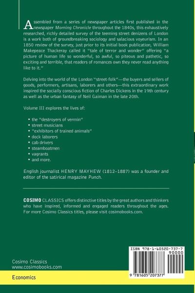 Assembled from a series of newspaper articles first published in the newspaper Morning Chronicle throughout the 1840s, this exhaustively researched, richly detailed survey of the teeming street denizens of London is a work both of groundbreaking sociology and salacious voyeurism. In an 1850 review of the survey, just prior to its initial book publication, William Makepeace Thackeray called it "tale of terror and wonder" offering "a picture of human life so wonderful, so awful, so piteous and pathetic, so exciting and terrible, that readers of romances own they never read anything like to it." Delving into the world of the London "street-folk"-the buyers and sellers of goods, performers, artisans, laborers and others-this extraordinary work inspired the socially conscious fiction of Charles Dickens in the 19th century as well as the urban fantasy of Neil Gaiman in the late 20th. Volume III explores the lives of: ¿ the "destroyers of vermin" ¿ street musicians ¿ "exhibitors of trained animals" ¿ dock laborers ¿ cab drivers ¿ steamboatmen ¿ vagrants ¿ and more. English journalist HENRY MAYHEW (1812-1887) was a founder and editor of the satirical magazine Punch.