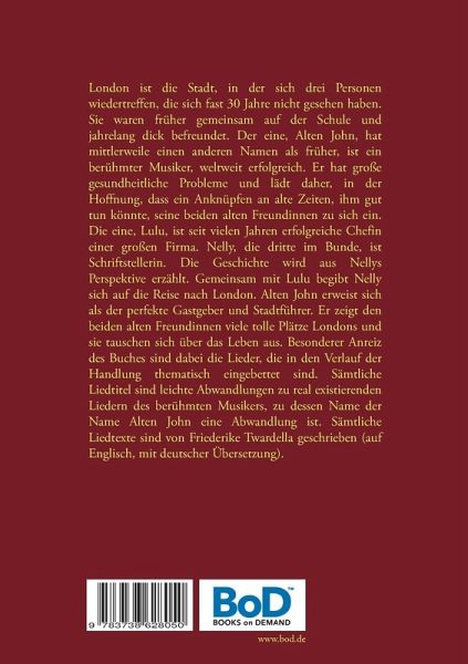 London ist die Stadt, in der sich drei Personen wiedertreffen, die sich fast 30 Jahre nicht gesehen haben. Sie waren früher gemeinsam auf der Schule und jahrelang dick befreundet. Der eine, Alten John, hat mittlerweile einen anderen Namen als früher, ist ein berühmter Musiker, weltweit erfolgreich. Er hat große gesundheitliche Probleme und lädt daher, in der Hoffnung, dass ein Anknüpfen an alte Zeiten, ihm gut tun könnte, seine beiden alten Freundinnen zu sich ein. Die eine, Lulu, ist seit vielen Jahren erfolgreiche Chefin einer großen Firma. Nelly, die dritte im Bunde, ist Schriftstellerin. Die Geschichte wird aus Nellys Perspektive erzählt. Gemeinsam mit Lulu begibt Nelly sich auf die Reise nach London. Alten John erweist sich als der perfekte Gastgeber und Stadtführer. Er zeigt den beiden alten Freundinnen viele tolle Plätze Londons und sie tauschen sich über das Leben aus. Besonderer Anreiz des Buches sind dabei die Lieder, die in den Verlauf der Handlung thematisch eingebettet sind. Sämtliche Liedtitel sind leichte Abwandlungen zu real existierenden Liedern des berühmten Musikers, zu dessen Name der Name Alten John eine Abwandlung ist. Sämtliche Liedtexte sind von Friederike Twardella geschrieben (auf Englisch, mit deutscher Übersetzung).