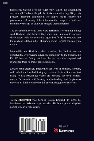 Distressed, George sees no other way. When the government declares all Herbaht illegal, he insists on releasing Kitty, his peaceful Herbaht companion. He hopes she'll survive the government's cleansing of the feline race that escaped to Earth one thousand years ago as civil war ravaged their homeland. The government sees no other way. Terrorism is escalating among wild Herbaht, who believe they must hunt humans to survive. Government raids and roundups begin. Fearful, Kitty ventures into the wild and is taken in by February, a rogue Herbaht constantly on the run. Meanwhile, the Herbahts' alien enemies, the Eschiff, see an opportunity. By providing advanced technology to the humans, the Eschiff hope to finally eradicate the cat race that angered and abandoned them so many generations ago. London Wild creatively intertwines the lives of humans, Herbaht, and Eschiff, each with differing agendas and desires. Some are just trying to live peacefully; others are carrying out their leaders' orders. But maybe with honesty, understanding, and forgiveness they can all finally overcome this ancient struggle for survival.