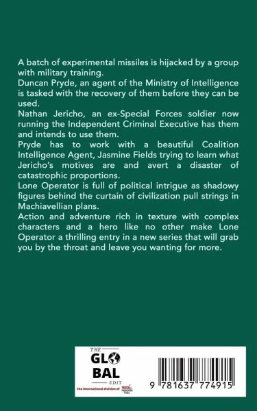 A batch of experimental missiles is hijacked by a group with military training. Duncan Pryde, an agent of the Ministry of Intelligence is tasked with the recovery of them before they can be used. Nathan Jericho, an ex-Special Forces soldier now running the Independent Criminal Executive has them and intends to use them. Pryde has to work with a beautiful Coalition Intelligence Agent, Jasmine Fields trying to learn what Jericho's motives are and avert a disaster of catastrophic proportions. Lone Operator is full of political intrigue as shadowy figures behind the curtain of civilization pull strings in Machiavellian plans. Action and adventure rich in texture with complex characters and a hero like no other make Lone Operator a thrilling entry in a new series that will grab you by the throat and leave you wanting for more.