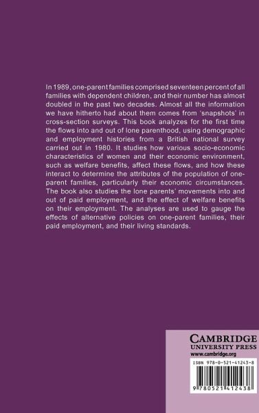 In 1989, one-parent families comprised seventeen percent of all families with dependent children, and their number almost doubled in the previous two decades. Almost all the information we previously had about them came from 'snapshots' in cross-section surveys. This 1991 book analyzes the flows into and out of lone parenthood, using demographic and employment histories from a British national survey carried out in 1980. It studies how various socio-economic characteristics of women and their economic environment, such as welfare benefits, affect these flows, and how these interact to determine the attributes of the population of one-parent families, particularly their economic circumstances. The book also studies the lone parents' movements into and out of paid employment, and the effect of welfare benefits on their employment. The analyses are used to gauge the effects of alternative policies on one-parent families, their paid employment, and their living standards.
