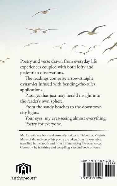 Poetry and verse drawn from everyday life experiences coupled with both lofty and pedestrian observations. The readings comprise arrow-straight dynamics infused with bending-the-rules applications. Passages that just may herald insight into the reader's own sphere. From the sandy beaches to the downtown city lights. Your eyes, my eyes-seeing almost everything. Poetry for everyone.