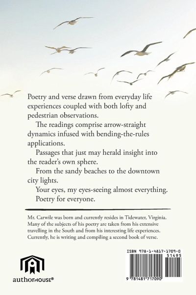 Poetry and verse drawn from everyday life experiences coupled with both lofty and pedestrian observations. The readings comprise arrow-straight dynamics infused with bending-the-rules applications. Passages that just may herald insight into the reader's own sphere. From the sandy beaches to the downtown city lights. Your eyes, my eyes-seeing almost everything. Poetry for everyone.