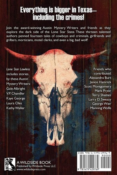 Everything is bigger in Texas, including the crimes! Join the award-winning Austin Mystery Writers and friends as they explore the dark side of the Lone Star State. These thirteen talented authors penned fourteen tales of cowboys and criminals, girlfriends and grifters, morticians, motel clerks, and even a big, bad wolf! Lone Star Lawless includes stories by the Austin Mystery Writers: Gale Albright, V.P. Chandler, Kaye George, Laura Oles, and Kathy Waller. The friends who contributed are: Alexandra Burt, Janice Hamrick, Scott Montgomery, Mark Pryor, Terry Shames, Larry D. Sweazy, George Wier, and Manning Wolfe.