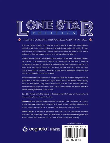 Lone Star Politics: Theories, Concepts, and Political Activity in Texas blends the history of political activity in the state with theories that underlie and explain this activity. Through classic and contemporary political literature, students learn about the unique political culture that exists in Texas and how governments at various levels function within it. Students explore topics such as the evolution and impact of the Texas Constitution, federalism, the role of local governments in the state, and the role of the executive branch. They study the legislature and judiciary and see how conservative ideology influences both public and social policy. They become familiar with the state's economy, its political parties, and their roles in the evolution of the state. The book concludes with an examination of interest groups and the parts they play in the political system. The third edition features discussions of new political situations that have emerged since the publication of the second edition. New topics covered include the dispute between Disney World and Ron DeSantis, party politics at the country level, the role of the county treasurer, community college budget allocations, Texas's Republican legislature, and the 88th legislature session following the Uvalde school shooting. Lone Star Politics is ideal for classes on Texas government that focus on the concepts and theories driving the state's political activity.