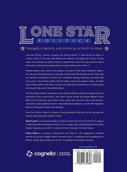 Lone Star Politics: Theories, Concepts, and Political Activity in Texas blends the history of political activity in the state with theories that underlie and explain this activity. Through classic and contemporary political literature, students learn about the unique political culture that exists in Texas and how governments at various levels function within it. Students explore topics such as the evolution and impact of the Texas Constitution, federalism, the role of local governments in the state, and the role of the executive branch. They study the legislature and judiciary and see how conservative ideology influences both public and social policy. They become familiar with the state's economy, its political parties, and their roles in the evolution of the state. The book concludes with an examination of interest groups and the parts they play in the political system. The third edition features discussions of new political situations that have emerged since the publication of the second edition. New topics covered include the dispute between Disney World and Ron DeSantis, party politics at the country level, the role of the county treasurer, community college budget allocations, Texas's Republican legislature, and the 88th legislature session following the Uvalde school shooting. Lone Star Politics is ideal for classes on Texas government that focus on the concepts and theories driving the state's political activity.