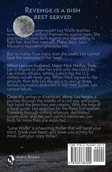 Revenge is a dish best served. Ex-military language expert Lex Wolfe teaches women how to defend themselves against men. She practices her own skills against any man willing to fight her. And few men will. These days, Lex's fearsome reputation precedes her. But no matter how many men she beats, Lex cannot beat the memories in her head. When Lex's ex-husband, Major Nick Hadley, finds Lex in Manila to offer her a job only she could do, Lex initially refuses, setting a price tag the U.S. military would never pay. When Nick agrees to the amount, then tells Lex the job is to rescue three female journalists abducted in war-torn Sudan, Lex cannot refuse. Once she arrives in Khartoum, alone, Lex begins a journey through the middle of a civil war, witnessing first-hand the atrocities war creates. With the help of a local guide, Lex searches for the three lost women. Traveling through shifting alliances, decimated countryside, and her own painful memories, Lex finds far more than she expected. "Lone Wolfe" is a haunting thriller that will bend your mind, break your heart, and leave you aching for more. Get your copy today!