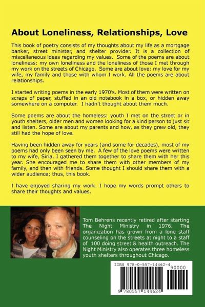 This book of poetry consists of my thoughts about my life as a mortgage banker, street minister, and shelter provider. It is a collection of miscellaneous ideas regarding my values. Some of the poems are about loneliness: my own loneliness and the loneliness of those I met through my work on the streets of Chicago. Some are about love: my love for my wife, my family and those with whom I work. All the poems are about relationships. Some poems are about the homeless: youth I met on the street or in youth shelters, older men and women looking for a kind person to just sit and listen. Some are about my parents and how, as they grew old, they still had the hope of love.