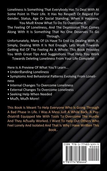 Loneliness Is Something That Everybody Has To Deal With At Some Point In Their Life. It Has No Respect Or Regard For Gender, Status, Age Or Social Standing. When It Happens, You Must Know What To Do To Overcome It. The Feeling Of Loneliness, And The Depression That Comes Along With It Is Something That No One Deserves To Go Through. Unfortunately, Many Of Us Have To End Up Dealing With It. Simply, Dealing With It Is Not Enough, Lets Work Towards Getting Rid Of The Feeling As A Whole. This Book Provides You With Great Tips And Suggestions That Help You Work Towards Deleting Loneliness From Your Life Completel Here Is A Preview Of What You'll Learn...Understanding Loneliness Symptoms And Behavioral Patterns Evolving From Loneliness Internal Changes To Overcome Loneliness External Changes To Overcome Loneliness Seeking Help When Needed Much, Much More! This Book Is Meant To Help Everyone Who Is Going Through A Bad Phase In Life. I Was A Mess Just A While Back. A Psychiatrist Equipped Me With Tools To Overcome The Hurdle And They Actually Worked. I Want To Help Out Others Who Feel Lonely And Isolated And That Is Why I Have Written This Book..