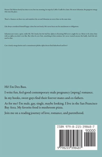 Doctor Zak Meiose barely has time to rest, but one morning, he stops by Coffee Cradle for a latte. He meets Sebastian, the gorgeous omega who runs the place. There's a Siamese cat there too, and somehow the cat and Sebastian are never there at the same time. Zak always considered himself happy: alone but not lonely. He's never been one for attachments or obligations. Sebastian just wants a quiet, stable life. He's lonely, but the bad boy alphas in Knotting Hill never caught his eye. Better to be alone than with an alpha you don't even like. But when he sees Zak, something in him awakens: he's never wanted anyone this badly. And Zak isn't used to that. Can a lonely omega barista and a commitment-phobic alpha doctor find fatherhood and love?