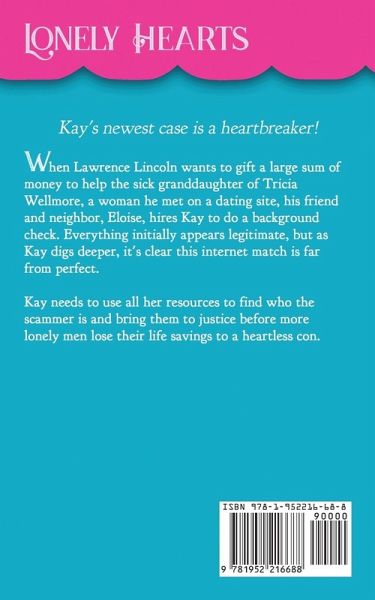Kay's newest case is a heartbreaker! When Lawrence Lincoln wants to gift his life savings to help the sick granddaughter of Tricia Wellmore, a woman he met on a dating site, his friend and neighbor, Eloise, hires Kay to do a background check. Everything initially appears legitimate, but as Kay digs deeper, it's clear this internet match is far from perfect. Kay needs to use all her resources to find who the scammer is and bring them to justice before more lonely men lose their life savings to a heartless con.