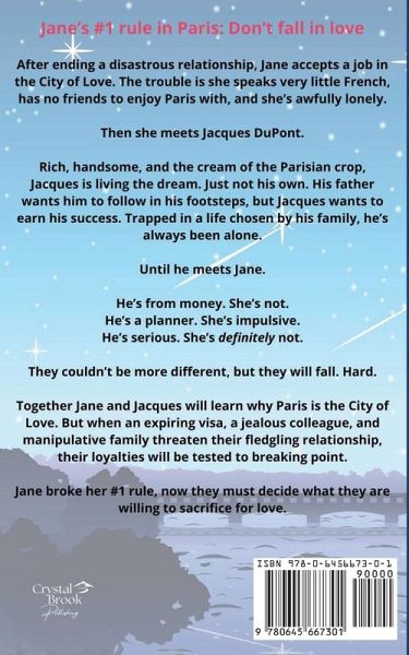 Jane's #1 rule in Paris: Don't fall in love After ending a disastrous relationship, Jane accepts a job in the City of Love. The trouble is she speaks very little French, has no friends to enjoy Paris with, and she's awfully lonely. Then she meets Jacques DuPont. Rich, handsome, and the cream of the Parisian crop, Jacques is living the dream. Just not his own. His father wants him to follow in his footsteps, but Jacques wants to earn his success. Trapped in a life chosen by his family, he's always been alone. Until he meets Jane. He's from money. She's not. He's a planner. She's impulsive. He's serious. She's definitely not. They couldn't be more different, but they will fall. Hard. Together Jane and Jacques will learn why Paris is the City of Love. But when an expiring visa, a jealous colleague, and manipulative family threaten their fledgling relationship, their loyalties will be tested to breaking point. Jane broke her #1 rule, now they must decide what they are willing to sacrifice for love.
