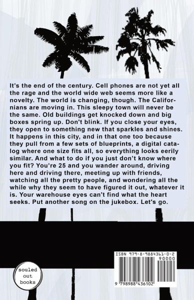 It's the end of the century. Cell phones are not yet all the rage and the world wide web seems more like a novelty. The world is changing, though. The Californians are moving in. This sleepy town will never be the same. Old buildings get knocked down and big boxes spring up. Don't blink. If you close your eyes, they open to something new that sparkles and shines. It happens in this city, and in that one too because they pull from a few sets of blueprints, a digital catalog where one size fits all, so everything looks eerily similar. And what to do if you just don't know where you fit? You're 25 and you wander around, driving here and driving there, meeting up with friends, watching all the pretty people, and wondering all the while why they seem to have figured it out, whatever it is. Your warehouse eyes can't find what the heart seeks. Put another song on the jukebox. Let's go.