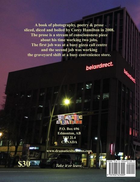 "Lonely Night Songs" contains a journal/stream of consciousness piece written about Hamilton's time working at a busy 7-11 and a pizza call centre. It also contains poetry that was all written between May and October 2008 and Hamilton's black and white photography of Edmonton street scenes at night.