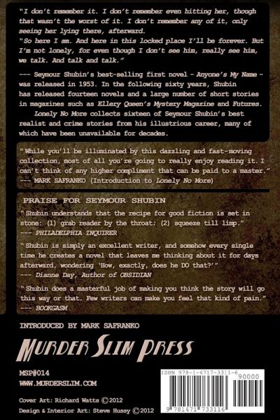 Seymour Shubin's best-selling first novel - 'Anyone's My Name' - was released in 1953. In the following sixty years, Shubin has released fourteen novels and a large number of short stories in magazines such as 'Ellery Queen's Mystery Magazine' and 'Futures.' 'Lonely No More' collects sixteen of Seymour Shubin's best realist and crime stories from his illustrious career, many of which have been unavailable for decades. 'Lonely No More' is published by Murder Slim Press, the renowned UK publishers of Mark SaFranko ('Hating Olivia'), Robert McGowan ('NAM') and 'The Savage Kick Literary Magazine' (which has featured Tony O'Neill, Dan Fante, Jim Goad, Doug Stanhope, Joe R. Lansdale and many more).
