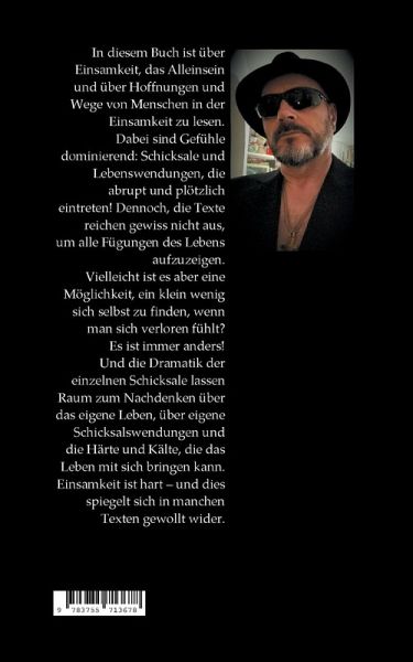 In diesem Buch ist über Einsamkeit, das Alleinsein und über Hoffnungen und Wege von Menschen in der Einsamkeit zu lesen. Dabei sind Gefühle dominierend: Schicksale und Lebenswendungen, die abrupt und plötzlich eintreten! Dennoch, die Texte reichen gewiss nicht aus, um alle Fügungen des Lebens aufzuzeigen. Vielleicht ist es aber eine Möglichkeit, ein klein wenig sich selbst zu finden, wenn man sich verloren fühlt? Es ist immer anders! Und die Dramatik der einzelnen Schicksale lassen Raum zum Nachdenken über das eigene Leben, über eigene Schicksalswendungen und die Härte und Kälte, die das Leben mit sich bringen kann. Einsamkeit ist hart - und dies spiegelt sich in manchen Texten gewollt wider.