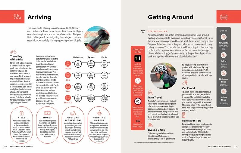 Colour maps (including elevation charts) and images throughoutSpecial features - on Australia's highlights for cyclist, kid-friendly rides, accessible trails and what to take Our Picks section helps you plan your trip and select rides that appeal to your interests Region profiles cover when to go, where to stay, what's on, cultural insights, and local food and drink recommendations to refuel and refresh. Essential info at your fingertips - ride itineraries accompanied by illustrative maps are combined with details about ride duration, distance, terrain, start/end locations (including bike rental options) and difficulty (classified as easy, easy-moderate, moderate, moderate-hard, or hard)Over 50 maps