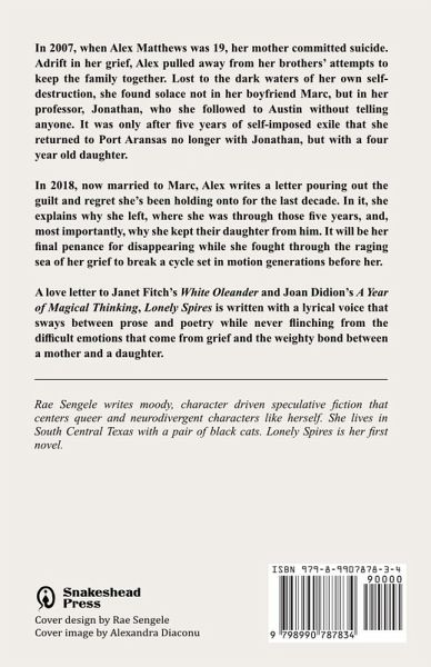 In 2007, when Alex Matthews was 19, her mother committed suicide. Adrift in her grief, Alex pulled away from her brothers' attempts to keep the family together. Lost to the dark waters of her own self-destruction, she found solace not in her boyfriend Marc, but in her professor, Jonathan, who she followed to Austin without telling anyone. It was only after five years of self-imposed exile that she returned to Port Aransas no longer with Jonathan, but with a four year old daughter. In 2018, now married to Marc, Alex writes a letter pouring out the guilt and regret she's been holding onto for nearly a decade. In it, she explains why she left, where she was through those five years, and, most importantly, why she kept their daughter from him. It will be her final penance for disappearing while she fought through the raging sea of her grief to break a cycle set in motion generations before her. A love letter to Janet Fitch's White Oleander and Joan Didion's A Year of Magical Thinking, Lonely Spires is written with a lyrical voice that sways between prose and poetry while never flinching from the difficult emotions that come from grief and the weighty bond between a mother and a daughter.