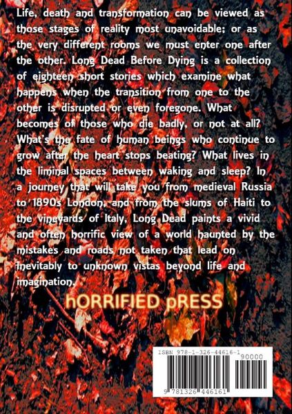Life, death and transformation can be viewed as those stages of reality most unavoidable; or as the very different rooms we must enter one after the other. Long Dead Before Dying is a collection of eighteen short stories which examine what happens when the transition from one to the other is disrupted or even foregone. What becomes of those who die badly, or not at all? What's the fate of human beings who continue to grow after the heart stops beating? What lives in the liminal spaces between waking and sleep? In a journey that will take you from medieval Russia to 1890s London, and from the slums of Haiti to the vineyards of Italy, Long Dead paints a vivid and often horrific view of a world haunted by the mistakes and roads not taken that lead on inevitably to unknown vistas beyond life and imagination.