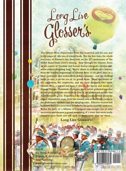 The Glosser Bros. Department Store in Johnstown, Pennsylvania has reopened, just for you, in the pages of this one-of-a-kind nonfiction book. For the first time, the whole true story of Glosser’s has been told, on the 25th anniversary of the fabled department store’s closing. Step through the famous doors on the corner of Franklin and Locust Streets, grab a brown-and-white-striped shopping bag, and smell the roasting peanuts and cashews. You’re about to embark on a journey from the humble beginnings of Glosser Bros. to its glory days as a multimillion-dollar corporation and the thrilling battle to save it on the eve of its grand finale. Read the stories of the executives, employees, and loyal shoppers who made Glosser Bros. a legend and kept it alive in the hearts and minds of Glosser Nation. Hundreds of photos, never before gathered together in one place, will take you back in time to the places and people that made Glosser’s great. Experience the things you loved best about the classic department store, from the roasted nuts to the Shaffer twins to the Halloween windows and amazing sales. Discover secrets and surprises that have never been revealed to the general public until now. Relive the story of a lifetime in a magical tour straight out of your memories and dreams, a grand reopening of a store that never really closed in the hearts of those who loved it.