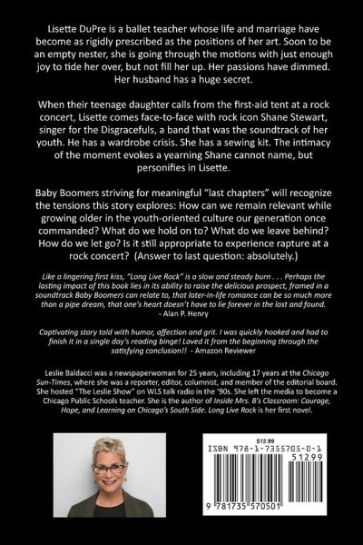 Lisette DuPre is a ballet teacher whose life and marriage have become as rigidly prescribed as the positions of her art. Soon to be an empty nester, she feels inauthentic, almost mechanical. Her passions have dimmed. Her husband has a huge secret. When their teenage daughter calls from the first-aid tent at a rock concert, Lesette comes face-to-face with rock icon, Shane Stewart, singer for the Disgracefuls, a band that was the soundtrack of her youth. He has a wardrobe crisis. She has a sewing kit. The intimacy of the moment evokes a yearning Shane cannot quite name, but personifies in Lisette, a full-grown woman, polar opposite of the models and groupies who spend the night and disappear. Shane is approaching a major milestone of his own and struggles to reconcile being "a man in full" when his work has always been to play and his lore leans toward juvenile delinquency. A merry band of memorable characters each play a hand in supporting the budding romance as they themselves experience self-discovery, accept change, revisit bad habits, redeem themselves, and dare to love. Baby Boomers striving for meaningful "last chapters" will recognize the tensions this story explores: How can we remain relevant while growing older in the youth-oriented culture we once commanded? How do we accept change, live with authenticity, leave a legacy? What do we hold on to? What do we leave behind? How do we let go? Is it still appropriate to experience rapture at a rock concert? (Answer to the last question: absolutely.) Long Live Rock is a shot in the arm of romance, friendship, deception, adventure, music, and hope for a live that arrives unexpectedly later in life, conflicting, confusing - and dazzling.