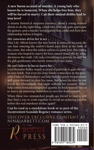 A new baron accused of murder. A young lady who knows he is innocent. When she helps free him, they will be forced to marry. Can their mutual dislike lead to true love? A steamy historical suspense romance, about a young woman driven to do the right thing, a lord who does not quite appreciate the gesture, and a murder investigation that could end their new relationship before it begins. Her conscience drives her to act ... Miss Lily Abbott knows the new baron is innocent because she saw him entering the widow's home next door at the time of the crime. But when the widow refuses to assist him, this young woman who hoped to marry for love cannot stand idly by when she knows the truth. Lily risks everything to provide an alibi for the glib gentleman who barely remembers her name. He can't believe he has to marry her ... Lord Brendan Ridley stands accused of patricide to gain the title he now holds. Not even his close family connection to the powerful Duke of Halmesbury can help him. He prays his paramour will come forward to clear his name, but honor dictates he not reveal his whereabouts that night without her consent. When help comes from an unexpected quarter, he finds himself forced to marry an annoying chatterbox to save her from scandal. When these two mismatched people are forced to marry, will they find a way to work together to reveal an enduring passion before the real murderer strikes again? Long Live the Baron is the delightful first book in the Inconvenient Scandals series of steamy Regency suspense romance books. If you like worthy heroes, strong heroines, fast-paced plots, and enduring connections, then you'll adore Nina Jarrett's charming novel. Buy Long Live the Baron for a tale of mystery and passion today! What Readers Are Saying: ¿¿¿¿¿ "I found this book impossible to put down!" - Sonia ¿¿¿¿¿ "Amazing book full of twists and turns, well-written characters and detailed descriptions, I couldn't put it down!" - Beccie ¿¿¿¿¿ "The story only gets better as you keep reading." - Carolina ¿¿¿¿¿ "I loved the strong female lead, Lilly Billy. Her babbling was delightful." - Ann S. ¿¿¿¿¿ "I enjoyed every page of the book!" - Prafulla Kg