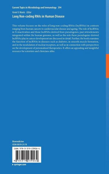 Understandingthe Complex Circuitry of lncRNAs at the X-inactivation Center and itsImplications in Disease Conditions.- Long Non-coding RNA ANRIL and Polycomb inHuman Cancers and Cardiovascular Disease.- Form and function of exosomeassociated long non-coding RNAs in cancer.- Long Non-coding RNAs in Lung Cancer.-Pseudogene-expressed RNAs: Emerging roles in gene regulation and disease.- Functionallong non-coding RNAs in vascular smooth muscle cells.- Long Non-coding RNAs asTargets and Regulators of Nuclear Hormone Receptors.- Non-codingtranscriptional landscape in human aging.- LncRNAs in stress response.- ExpressionSpecificity of Disease-Associated lncRNAs: towards Personalized Medicine.