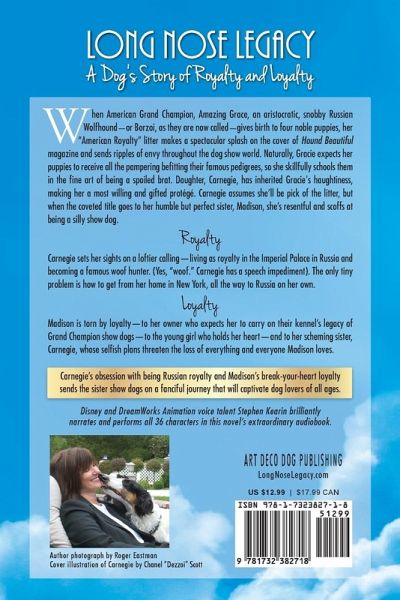 Winner 2020 GOLD Readers' Favorite (book), 2021 GOLD Readers' Favorite (Audiobook), 2020 Parents' Choice SILVER Award (Audiobook), Winner of 2019 B.R.A.G. Medallion. "An Undeniably Fun, Tail Wagging Romp! A Must Read!" (BookLife Prize). Carnegie, a pampered Borzoi wolfhound, comes of age in a misguided, daring, and delightful journey to find her royal home and become a famous wolf hunter. Will fame and royalty or love and loyalty win out? Disney and DreamWorks voice talent, Stephen Kearin, brilliantly narrates and performs all 36 characters in this novel's award-winning audiobook. Gracie, a snobby royal Borzoi wolfhound show dog, expects her noble puppies to follow in her pawprints of being a pampered princess. Daughter Carnegie has inherited Gracie's aristocratic attitude and assumes she'll be pick of the litter. When the coveted title goes to her humble but perfect sister, Madison, she is resentful and scoffs at being a silly show dog. Carnegie sets her sights on becoming a famous "woof hunter" and living as royalty in a palace like her ancestors. The only tiny problem is how to get from her home in New York, all the way to that palace, especially when she really doesn't have a clue where it is. Madison is torn by loyalty to her owner--who expects her to carry on their kennel's legacy of Grand Champion show dogs--to Anastasia, the young girl who holds her heart--and to her scheming sister, Carnegie, who needs her to carry out her royalty-obsessed plans. The illustration of Carnegie on the cover and the main character illustrations are by Chanel "Dezzoi" Scott.