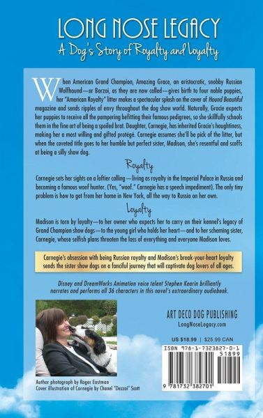 Winner 2020 GOLD Readers' Favorite (book), 2021 GOLD Readers' Favorite (Audiobook), 2020 Parents' Choice SILVER Award (Audiobook), Winner of 2019 B.R.A.G. Medallion. "An Undeniably Fun, Tail Wagging Romp! A Must Read!" (BookLife Prize). Carnegie, a pampered Borzoi wolfhound, comes of age in a misguided, daring, and delightful journey to find her royal home and become a famous wolf hunter. Will fame and royalty or love and loyalty win out? Disney and DreamWorks voice talent, Stephen Kearin, brilliantly narrates and performs all 36 characters in this novel's award-winning audiobook. Gracie, a snobby royal Borzoi wolfhound show dog, expects her noble puppies to follow in her pawprints of being a pampered princess. Daughter Carnegie has inherited Gracie's aristocratic attitude and assumes she'll be pick of the litter. When the coveted title goes to her humble but perfect sister, Madison, she is resentful and scoffs at being a silly show dog. Carnegie sets her sights on becoming a famous "woof hunter" and living as royalty in a palace like her ancestors. The only tiny problem is how to get from her home in New York, all the way to that palace, especially when she really doesn't have a clue where it is. Madison is torn by loyalty to her owner--who expects her to carry on their kennel's legacy of Grand Champion show dogs--to Anastasia, the young girl who holds her heart--and to her scheming sister, Carnegie, who needs her to carry out her royalty-obsessed plans. The illustration of Carnegie on the cover and the main character illustrations are by Chanel "Dezzoi" Scott.