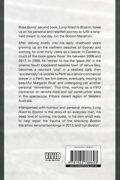 Ross Burns' second book, Long Road to Boston, takes us on his personal and heartfelt journey to fulfill a long-held dream to one day run the Boston Marathon. After delving briefly into his early childhood years growing up on the northern beaches of Sydney and working for over thirty years as a lawyer in Canberra, much of the book spans Ross' life between 2008 and 2017. In 2008, he 'retires' to live the 'good life' in the pristine South Gippsland seaside town of Venus Bay, becomes a reluctant 'chef' in a seafood café, then 'accidentally' re-locates to Perth as a senior commercial lawyer in a Perth law firm before, eventually, moving to beautiful Margaret River and undergoing yet another personal 'reinvention'. This time, working as a FIFO contractor on remote mine and rail construction sites in the spectacular Pilbara desert region of Western Australia. Interspersed with humour and personal drama, Long Road to Boston is the story of an everyday man, his deep love of running, his quest, in his own small way, to help repair the trauma of the shocking Boston Marathon terrorist bombings in 2013, and 'run Boston'.