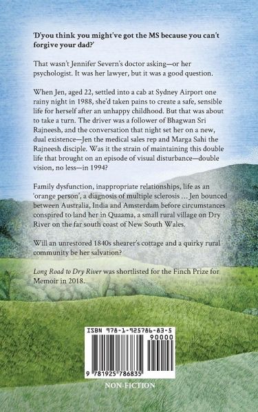 'D'you think you might've got the MS because you can’t forgive your dad?' That wasn't Jennifer Severn's doctor asking—or her psychologist. It was her lawyer, but it was a good question. When Jen, aged 22, settled into a cab at Sydney Airport one rainy night in 1988, she'd taken pains to create a safe, sensible life for herself after an unhappy childhood. But that was about to take a turn. The driver was a follower of Bhagwan Sri Rajneesh, and the conversation that night set her on a new, dual existence—Jen the medical sales rep and Marga Sahi the Rajneesh disciple. Was it the strain of maintaining this double life that brought on an episode of visual disturbance—double vision, no less—in 1994? Family dysfunction, inappropriate relationships, life as an 'Orange Person', a diagnosis of multiple sclerosis … Jen bounced between Australia, India and Amsterdam before circumstances conspired to land her in Quaama, a small rural village on Dry River on the far south coast of New South Wales. Will an unrestored 1840s shearer's cottage and a quirky rural community be her salvation? Long Road to Dry River was shortlisted for the Finch Prize for Memoir in 2018.
