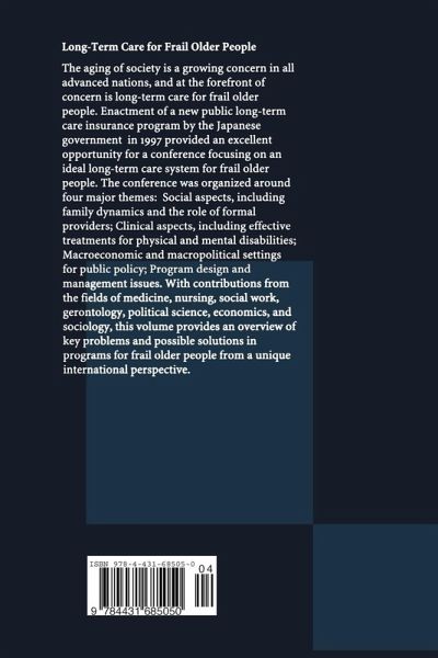 The aging of society is a growing concern in all advanced nations, and at the forefront of concern is long-term care for frail older people. Enactment of a new public long-term care insurance program by the Japanese government in 1997 provided an excellent opportunity for a conference focusing on an ideal long-term care system for frail older people. The conference was organized around four major themes: Social aspects, including family dynamics and the role of formal providers; Clinical aspects, including effective treatments for physical and mental disabilities; Macroeconomic and macropolitical settings for public policy; Program design and management issues. With contributions from the fields of medicine, nursing, social work, gerontology, political science, economics, and sociology, this volume provides an overview of key problems and possible solutions in programs for frail older people from a unique international perspective.