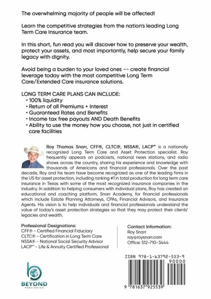 The overwhelming majority of people will be affected! Learn the competitive strategies from the nation's leading Long Term Care Insurance team. In the short, fun read you will discover how to preserve your wealth, protect your assets and most importantly help secure your family legacy with dignity. Avoid being a burden to your loved ones, create financial leverage today with the most competitive Long Term Care/Extended Care insurance solutions today; LONG TERM PLANS INCLUDE: ¿ 100% liquidity ¿ Return of all Premiums + interests ¿ Guaranteed Rates and Benefits ¿ Income tax free payouts AND Death Benefits ¿ Ability to use the money how you choose, not just in certified care facilities