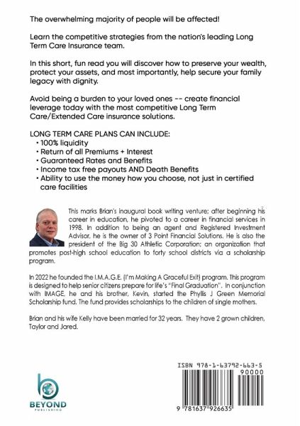 The overwhelming majority of people will be affected! Learn the competitive strategies from the nation's leading Long Term Care Insurance team. In this short, fun read you will discover how to preserve your wealth, protect your assets, and most importantly, help secure your family legacy with dignity. Avoid being a burden to your loved ones - create financial leverage today with the most competitive Long Term Care/Extended Care insurance solutions. LONG TERM CARE PLANS CAN INCLUDE: ¿ 100% liquidity ¿ Return of all Premiums + Interest ¿ Guaranteed Rates and Benefits ¿ Income tax free payouts AND Death Benefits ¿ Ability to use the money how you choose, not just in certified care facilities This marks Brian's inaugural book writing venture; after beginning his career in education, he pivoted to a career in financial services in 1998. In addition to being an agent and Registered Investment Advisor, he is the owner of 3 Point Financial Solutions. He is also the president of the Big 30 Athletic Corporation: an organization that promotes post-high school education to forty school districts via a scholarship program. In 2022 he founded the I.M.A.G.E. (I'm Making A Graceful Exit) program. This program is designed to help senior citizens prepare for life's "Final Graduation". In conjunction with IMAGE, he and his brother, Kevin, started the Phyllis J Green Memorial Scholarship fund. The fund provides scholarships to the children of single mothers. Brian and his wife Kelly have been married for 32 years. They have 2 grown children, Taylor and Jared.