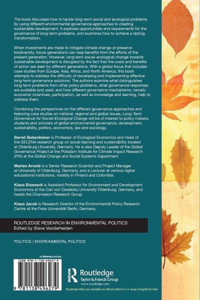 The book discusses how to tackle long-term social and ecological problems by using different environmental governance approaches to creating sustainable development. It explores opportunities and requirements for the governance of long-term problems, and examines how to achieve a lasting transformation.