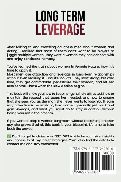 A woman would rather be single than be with a man she's not attracted to. Just because you are in a relationship with her doesn't mean the work is over. If you've ever been in a relationship with a woman, you may have noticed she loses attraction over time. This book reveals how to keep power long-term in your relationships with women. You need to understand the language of women and the realities of today's dating environment to maintain leverage at all times. We live in times where the majority of women leave relationships. They don't love the man they're with, they're unhappy in marriages, and a significant number of them cheat, while at the same time most men find themselves in a relationship where they're merely being tolerated, not celebrated. The woman might have had genuine desire at the start, but over time, that desire fades to zero. They lose leverage, and the relationship becomes a lifeless coexistence until she eventually leaves. When men start noticing this, they begin chasing women, seeking validation, love, and intimacy - but often this makes the situation worse. In this book, I'll outline the rules required to maintain a woman's attraction, respect, and genuine desire over time. I want YOU to have the power in the relationship, NOT HER. You'll discover:How to maintain attraction and leverage through the years so you are always in control. All the things men do wrong in long-term relationships. Why women stop respecting and desiring men over time - and the hidden behaviors that cause it. The fatal mistake most men make once they're "comfortable" in a relationship. How to flip the dynamic when she's losing attraction, but more importantly, how to avoid it from happening in the first place. Why giving too much attention and affection actually weakens her desire. How to maintain attraction and leverage when cohabitating and/or married. How over-validating a woman leads to contempt and disrespect over time. The feelings you need to maintain over time for her to keep being attracted to you. How to avoid her losing attraction for you and how to become the man she respects, desires, and wants to stay with long-term. And many more, that's just scratching the surface... Who is this book for?Men who are, or are not, in a relationship - it will help you either way to understand the dynamics. Men who feel they've lost control in their relationship or marriage, have lost their woman's attraction and want to get it back. Men who are tired of disrespect, lack of genuine desire, and want her chasing their validation. Men who want long-term power, respect, and desire. Men who want to be in charge of their relationship - not her. If you read my other book Female Nature, this is the continuation. Most relationships fail because the woman loses attraction first. That's just what it is. She's the one who pulls back, breaks up, and files for divorce. If you want to understand how this works, stop what you are doing wrong, and regain her attraction - Then scroll up and click the "Add to Cart" button now and I will help you figure this out.