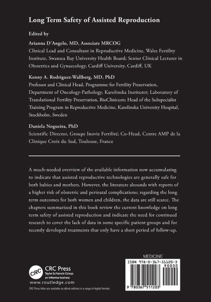 Acknowledgments. List of Contributors. 1.The Effect of Ovarian Stimulation on Short Term Maternal Outcomes. 2.Evidence of the long-term safety of ART and fertility drugs regarding cancer risk. 3.Maternal and obstetrical outcomes after IVF indicated by a male factor. 4.The long-term outcomes of children conceived through ART. 5.Maternal and obstetrical outcomes after transfer of cryopreserved embryos. 6.Safety of Assisted Reproduction and fertility preservation in women with Turner Syndrome. 7.Maternal and obstetrical outcomes after oocyte cryopreservation. 8.Perinatal complications in pregnancies achieved using donor oocytes. 9.Obstetrical risks and pregnancy outcomes specific to patients with very advanced maternal age (over 45). 10.Obstetric, perinatal, and post-natal outcomes after PGT. 11.Multiple birth outcomes: A minimizing strategy for elective single embryo transfer [eSET]. 12.Obstetrical outcomes after cancer treatment with or without ART. 13.An overview of ART and the risks of childhood cancer. 14.Obstetrical and perinatal outcomes following gestational surrogacy. 15.Birth outcomes of children born after treatments still considered innovative: in vitro oocyte maturation (IVM). 16.An overview on the clinical outcomes from ovarian tissue cryopreservation. 17.In Vitro embryo development: Implications for epigenetic regulation. 18.Psychosocial effects of undergoing ART. 19.Psychosocial Adjustment in Offspring Conceived through ART: Childhood, Adolescence and Young Adulthood. 20.The Long-Term Safety of ART: Ethical Aspects. Index.