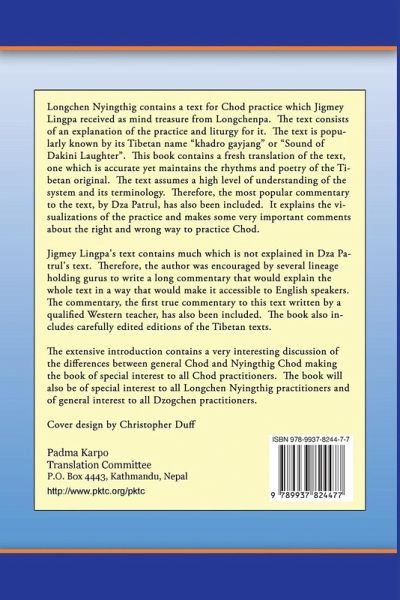 Longchen Nyingthig contains a text for Chod practice which Jigmey Lingpa received as mind treasure from Longchenpa. The text consists of an explanation of the practice and liturgy for it. The text is popularly known by its Tibetan name "khadro gayjang" or "Sound of Dakini Laughter". This book contains a fresh translation of the text, one which is accurate yet maintains the rhythms and poetry of the Tibetan original. The text assumes a high level of understanding of the system and its terminology. Therefore, the most popular commentary to the text, by Dza Patrul, has also been included. It explains the visualizations of the practice and makes some very important comments about the right and wrong way to practice Chod. Jigmey Lingpa’s text contains much which is not explained in Dza Patrul’s text. Therefore, the author was encouraged by several lineage holding gurus to write a long commentary that would explain the whole text in a way that would make it accessible to English speakers. The commentary, the first true commentary to this text written by a qualified Western teacher, has also been included. The book also includes carefully edited editions of the Tibetan texts. The extensive introduction contains a very interesting discussion of the differences between general Chod and Nyingthig Chod making the book of special interest to all Chod practitioners. The book will also be of special interest to all Longchen Nyingthig practitioners and of general interest to all Dzogchen practitioners.