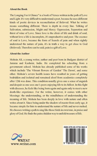 The Longing For A Glance" is a book of Verses written in the path of Love and Light. It's very difficult to understand a poet, because he uses different kinds of poetic devices in reconciliation of Beloved. What he writes means something different. There is depth in every line. Talking of Salivation, submission, Might and Mercy. Oppression, Separation and thirst of wine of Love. Since love is the elixir of life and drink of soul, without love a life is incomplete, it's unproductive and poor. The essence of soul is Love, because the form of Search of pain and when rightly understood the nature of pain, it's in truth a way to get close to God (Beloved). Therefore can be said, pain is a gift of Love.