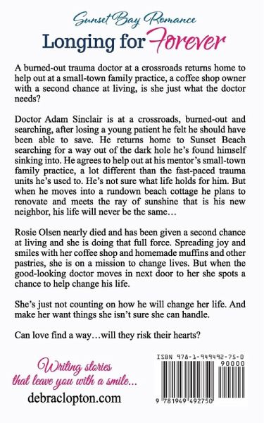 A burned-out trauma doctor at a crossroads returns home to help out at a small-town family practice, a coffee shop owner with a second chance at living, is she just what the doctor needs? Doctor Adam Sinclair is at a crossroads, burned-out and searching, after losing a young patient he felt he should have been able to save. He returns home to Sunset Beach searching for a way out of the dark hole he’s found himself sinking into. He agrees to help out at his mentor’s small-town family practice, a lot different than the fast-paced trauma units he’s used to. He’s not sure what life holds for him. But when he moves into a rundown beach cottage he plans to renovate and meets the ray of sunshine that is his new neighbor, his life will never be the same… Rosie Olsen nearly died and has been given a second chance at living and she is doing that full force. Spreading joy and smiles with her coffee shop and homemade muffins and other pastries, she is on a mission to change lives. But when the good-looking doctor moves in next door to her she spots a chance to help change his life. She’s just not counting on how he will change her life. And make her want things she isn’t sure she can handle. Can love find a way…will they risk their hearts?