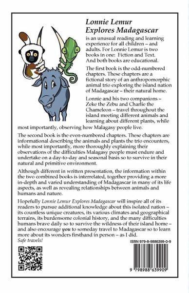 Lonnie Lemur Explores Madagascar (c) is two enjoyable children's books combined within one colorful book cover - a fun fictional adventure and a revealing informational text. Together, these different writing styles introduce the curious reader to many of the creatures that live on the island that is so close to the continent of Africa, and how the Malagasy people live within their underdeveloped isolated nation. The two books share much of the same information - only presented differently - about the island's geographical environments, its various climatic and seasonal conditions, the life habits of numerous island animals within these different environs, and how Malagasy people live far different lives compared to people living in more developed modern nations. Lonnie Lemur, along with his two travel mates - Zeke the Zebu and Charlie the Chameleon - explore Madagascar meeting a variety of native birds and reptiles and amphibians and arachnid and insects and mammals only to be found living on this remote island, and learn about how these different creatures live within their chosen surroundings. During their arduous adventure trekking throughout the rugged island, the traveling trio quietly observe Malagasy men and women and children working together so to survive within difficult natural circumstances. The purpose of Lonnie Lemur Explores Madagascar (c) is to inform many fortunate children throughout the world as to how different and how difficult daily life is in many underdeveloped nations of the world, and to hopefully encourage these fortunate children and their parents - or even when these fortunate children grow into adults - to travel to underdeveloped nations, like Madagascar, so to have a personal learning experience of how less fortunate people struggle to live. Also, the small amount of initial earnings by this author in the sale of this book - and in the sale of his other published children's books - will be accumulated into a fund so to help pay for life-saving childhood vaccines specifically for Malagasy children.