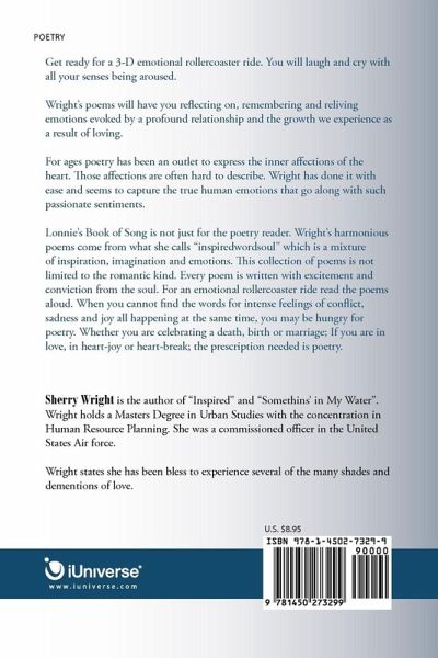 Get ready for a 3-D emotional rollercoaster ride. You will laugh and cry with all your senses being aroused. Wright's poems will have you reflecting on, remembering and reliving emotions evoked by a profound relationship and the growth we experience as a result of loving. For ages poetry has been an outlet to express the inner affections of the heart. Those affections are often hard to describe. Wright has done it with ease and seems to capture the true human emotions that go along with such passionate sentiments. Lonnie's Book of Song is not just for the poetry reader. Wright's harmonious poems come from what she calls "inspiredwordsoul" which is a mixture of inspiration, imagination and emotions. This collection of poems is not limited to the romantic kind. Every poem is written with excitement and conviction from the soul. For an emotional rollercoaster ride read the poems aloud. When you cannot find the words for intense feelings of conflict, sadness and joy all happening at the same time, you may be hungry for poetry. Whether you are celebrating a death, birth or marriage; If you are in love, in heart-joy or heart-break; the prescription needed is poetry.