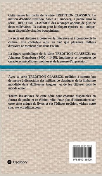Cette uvre (édition relié) fait partie de la série TREDITION CLASSICS. La maison d édition tredition, basée à Hambourg, a publié dans la série TREDITION CLASSICS des ouvrages anciens de plus de deux millénaires. Ils étaient pour la plupart épuisés ou uniquement disponible chez les bouquinistes. La série est destinée à préserver la littérature et à promouvoir la culture. Avec sa série TREDITION CLASSICS, tredition à comme but de mettre à disposition des milliers de classiques de la littérature mondiale dans différentes langues et de les diffuser dans le monde entier.