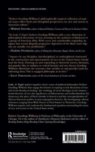 In "Look, a Negro!, political theorist Robert Gooding-Williams imaginatively and impressively unpacks fundamental questions around issues of race and racism. Inspired by Frantz Fanon's famous description of the profound effect of being singled out by a white child with the words "Look, a Negro!," his book is an insightful, rich and unusually wide ranging work of social criticism. These essays engage the themes that have centrally occupied recent discussion of race and racial identity, among them, the workings of racial ideology (including the interplay of gender and sexuality in the articulation of racial ideology); the viability of social constructionist theories of race; the significance of Afrocentrism and multiculturalism for democracy; the place of black identity in the imagination and articulation of America's inheritance of philosophy; and the conceptualization of African American politics in post-segregation America. "Look, a Negro! will be of interest to philosophers, political theorists, and critical race theorists, students of cultural studies and film, and readers concerned with the continuing importance of race-consciousness to democratic culture in the United States.
