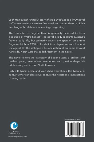 Look Homeward, Angel: A Story of the Buried Life is a 1929 novel by Thomas Wolfe. It is Wolfe's first novel, and is considered a highly autobiographical American coming-of-age story. The character of Eugene Gant is generally believed to be a depiction of Wolfe himself. The novel briefly recounts Eugene's father's early life, but primarily covers the span of time from Eugene's birth in 1900 to his definitive departure from home at the age of 19. The setting is a fictionalization of his home town of Asheville, North Carolina, called Altamont in the novel. The novel follows the trajectory of Eugene Gant, a brilliant and restless young man whose wanderlust and passion shape his adolescent years in rural North Carolina. Rich with lyrical prose and vivid characterizations, this twentieth-century American classic will capture the hearts and imaginations of every reader.
