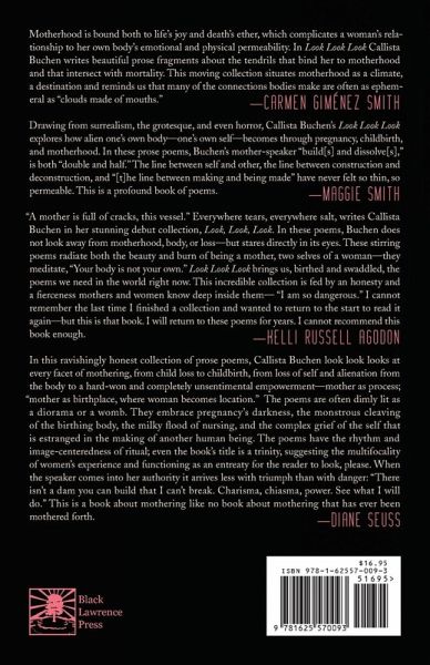 "Motherhood is bound both to life's joy and death's ether, which complicates a woman's relationship to her own body's emotional and physical permeablity. In LOOK LOOK LOOK Callista Buchen writes beautiful prose fragments about and the tendrils that bind her to motherhood and that intersection with mortality. This moving collection situates motherhood as a climate, a destination and reminds us that many of the connections bodies make are often as ephemeral as 'clouds made of mouths.'"-Carmen Gimenez Smith "Drawing from surrealism, the grotesque, and even horror, Callista Buchen's LOOK LOOK LOOK explores how alien one's own body-one's own self-becomes through pregnancy, childbirth, and motherhood. In these prose poems, Buchen's mother-speaker 'build[s] and dissolve[s],' is both 'double and half.' The line between self and other, the line between construction and deconstruction, and '[t]he line between making and being made' have never felt so thin, so permeable. This is a profound book of poems."-Maggie Smith "In this ravishingly honest collection of prose poems, Callista Buchen look look looks at every facet of mothering, from child loss to childbirth, from loss of self and alienation from the body to a hard-won and completely unsentimental empowerment-mother as process; 'mother as birthplace, where woman becomes location.' The poems are often dimly lit as a diorama or a womb. They embrace pregnancy's darkness, the monstrous cleaving of the birthing body, the milky flood of nursing, and the complex grief of the self that is estranged in the making of another human being. The poems have the rhythm and image-centeredness of ritual; even the book's title is a trinity, suggesting the multifocality of women's experience and functioning as an entreaty for the reader to look, please. When the speaker comes into her authority it arrives less with triumph than with danger: 'There isn't a dam you can build that I can't break. Charisma, chiasma, power. See what I will do.' This is a book about mothering like no book about mothering that has ever been mothered forth."-Diane Seuss "A mother is full of cracks, this vessel. 'Everywhere tears, everywhere salt,' writes Callista Buchen's in her stunning debut collection, LOOK LOOK LOOK. In these poems, Buchen does not look away from motherhood, body, or loss-but stares directly in its eyes. These stirring poems radiate both the beauty and burn of being a mother, two selves of a woman-they meditate, Your body is not your own. LOOK LOOK LOOK brings us, birthed and swaddled, the poems we need in the world right now. This incredible collection is fed by an honesty and a fierceness mothers and women know deep inside them-I am so dangerous. I cannot remember the last time I finished a collection and wanted to return to the start to read it again-but this is that book. I will return to these poems for years. I cannot recommend this book enough."-Kelli Russell Agodon